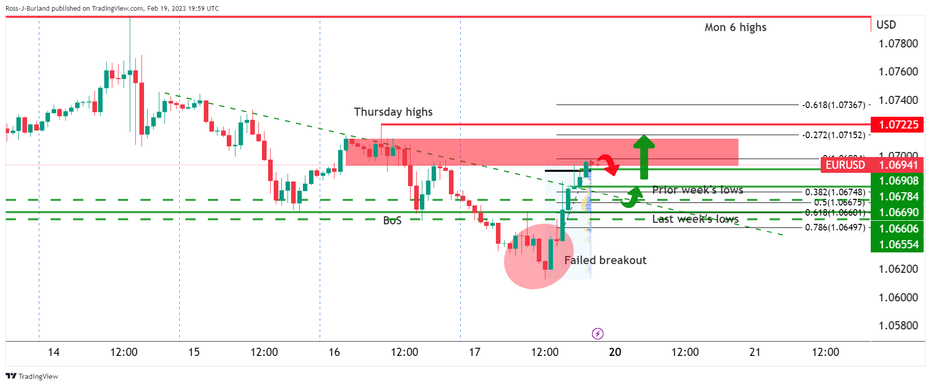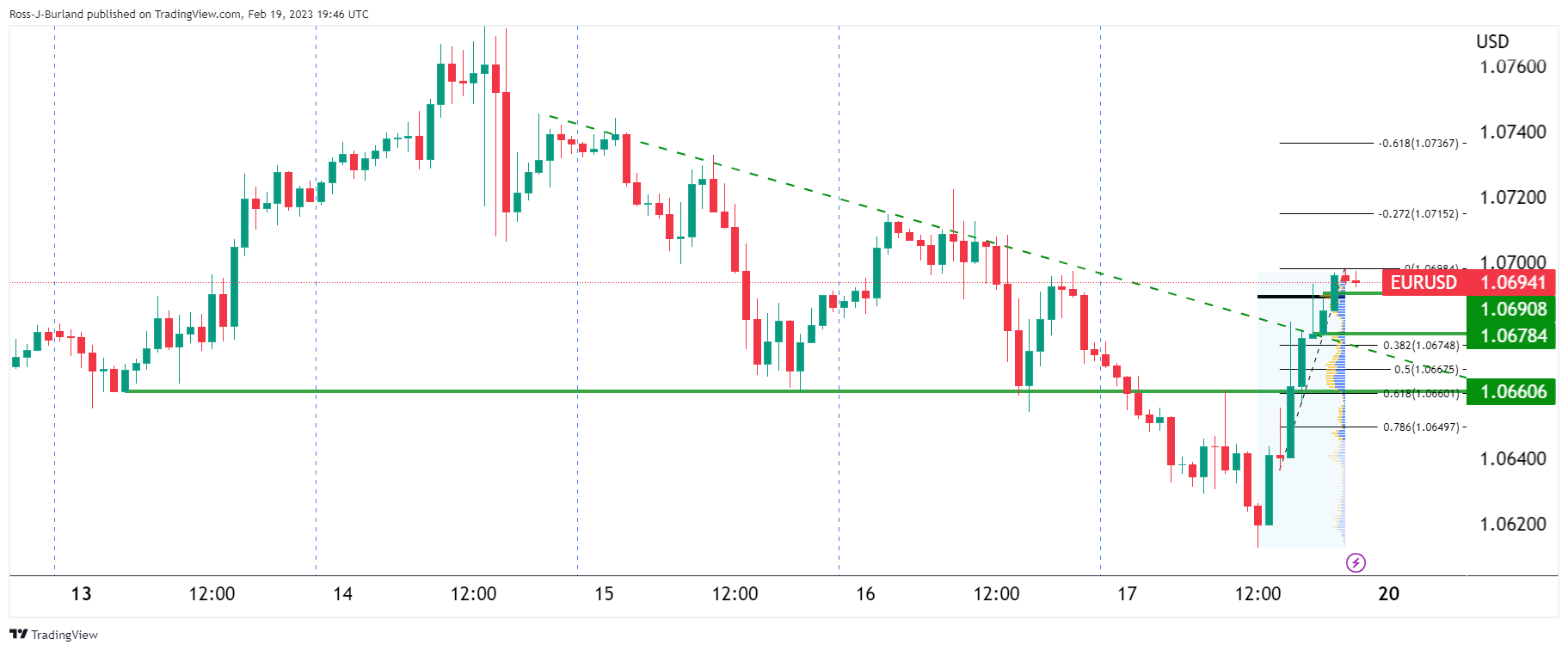 周五欧元/美元收于1.0700附近,欧元/美元突破上周低点后进入阻力区,跌破1.0680,以下??盘前分析将对趋势缐阻力进行分析: