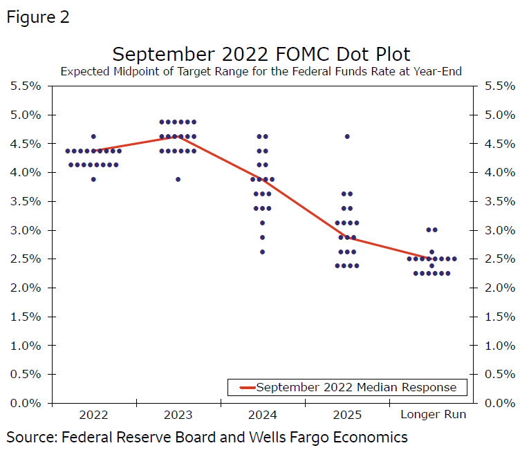 我们对联邦基金利率的最新预测也反映了美联储“不惜一切代价”遏制通胀的明显意??。正如美联储主席鲍威尔8月26日在杰克逊霍尔的讲话中所表达的那样,“联邦公??市场委员会目前的首要重点是将通货膨胀率降至2%的目标。 ”这一承诺在委员会9月21日政策会议结束时发布的“点状图”中得到了明显表达。绝大多数FOMC成员认為年底联邦基金利率的目标区间為4.00%-4.25%或4.25%-4.50%(图2)。简而言之,绝大多数政策制定者预计在2022年最后两次政策会议上加息100个基点或125个基点。此外,大多数委员会成员预计2023年将进一步收紧政策。我们之前的预测似乎与联邦公??市场委员会(FOMC)最近的想法和遏制通胀的决心不符。