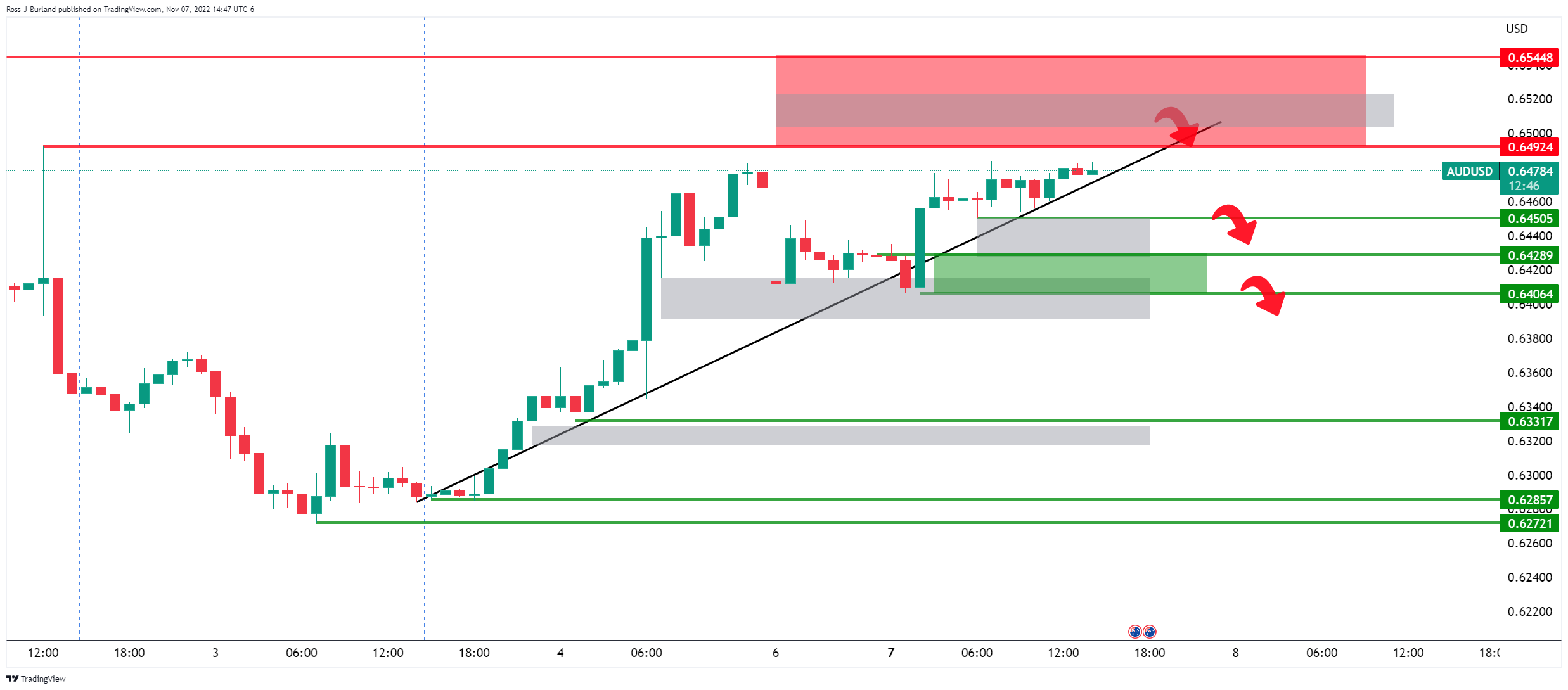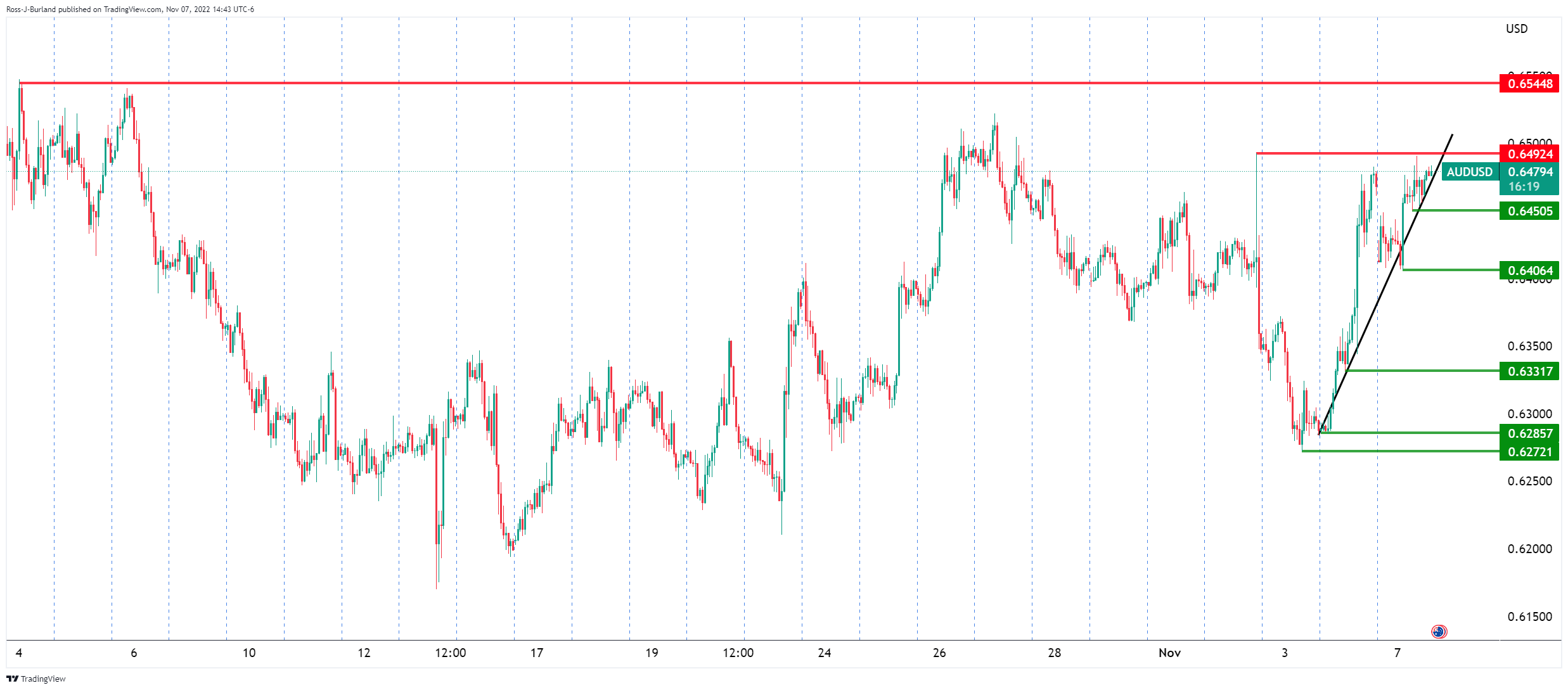 继上周五美国时段出现风险偏好情绪后,澳元兑美元周初上涨,需求上升。继上周公布的非农就业报告显示失业率上升至3.7%后,有迹象表明市场状况有所缓解。投资者希望,备受关注的美联储货币政策拐点可能即将到来,这将使全球股市的压力得到缓解。因此,正如下面的技术分析所显示的那样,美债收益率正停滞不前,澳元兑美元正加速接近上周高点。