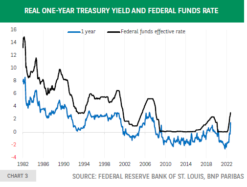 美联储会在什麽水平停止提高联邦基金利率?这个问题对美国经济的活动和需求以及金融市场都极為重要。在最近的新闻发布会上,美联储主席杰罗姆·鲍威尔对联邦公??市场委员会的反应功能含糊其词,但他确实提到了他们将关注实际利率。这就提出了一个问题,用哪种通胀指标来从名义利率转向实际利率?一个可能的解决方案是使用克利夫兰联邦储备银行(Federal Reserve Bank of Cleveland)计算的通胀预期期限结构。侭管最近大幅上涨,但除2018年外,一年期实际国债收益率仍低于前几次紧缩周期期间达到的水平。在通胀上升的背景下,紧缩周期显然不会结束。侭管美国1年期国债的实际收益率最近大幅上升,但仍低于此前紧缩周期期间达到的水平。美联储的工作还没有结束。