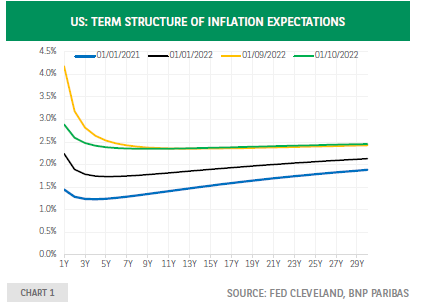 图1显示了自2021年初以来期限结构的演变。通胀预期全面上升,但在2021年基本上是平行上升,而今年,短期预期的增长远远超过长期预期。重要的是,政策收紧已导致短期预期在9月份达到峰值后大幅下降。然而,从历史角度来看,一年期预期通胀仍处于上世纪90年代初以来区间的高端(图2)。因此,侭管近期大幅上升,但除了2018年以外,一年期实际国债收益率仍低于前几次紧缩周期期间达到的水平(图3和表2)。