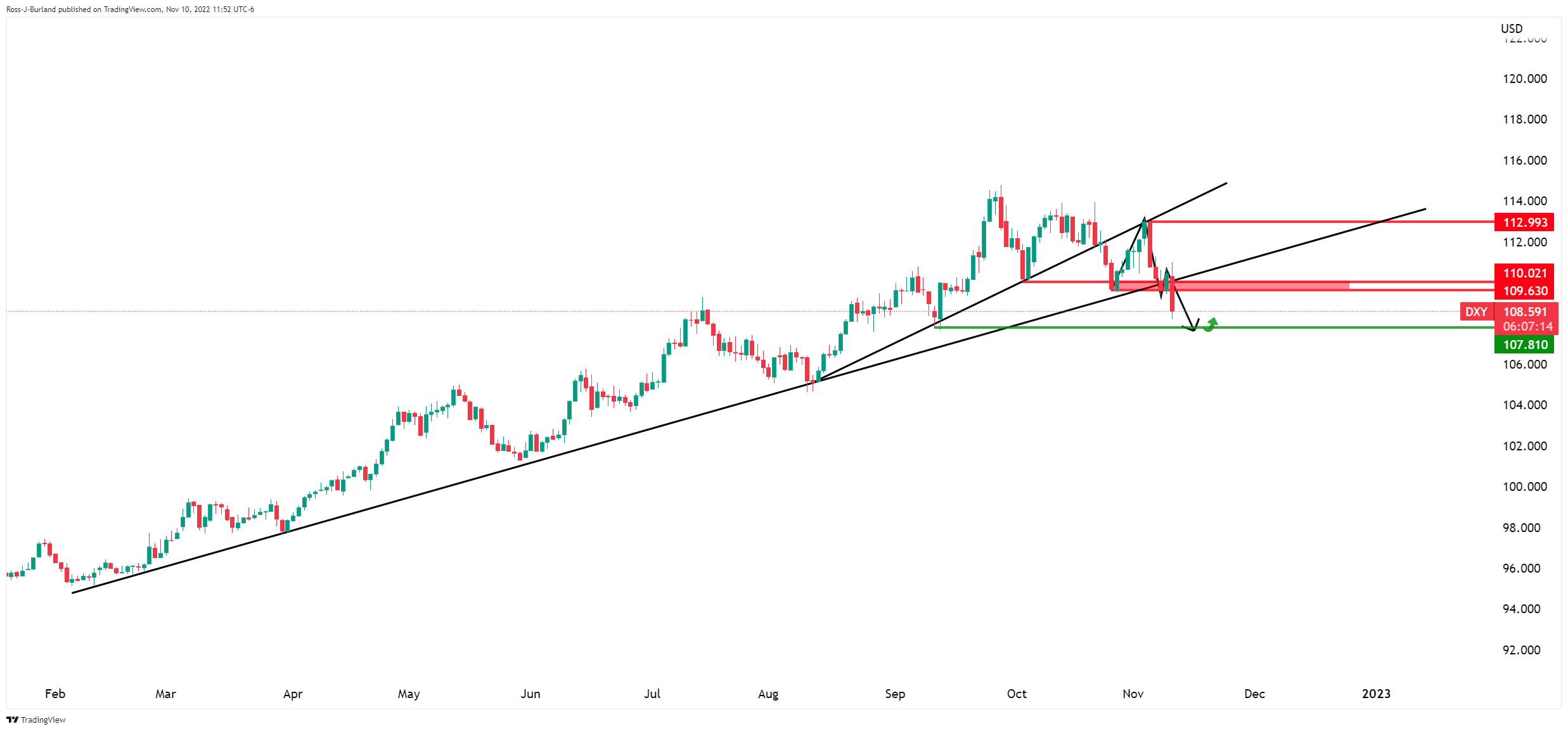 如果多头认為即使美联储政策利率将达到峰值,那也可能在更长时间内维持在较高水平,那麽多头将自上图所示的当美元大幅跌至107区域上侧后进入。