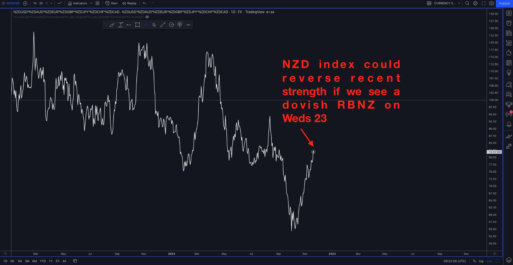 然而,最好的机会可能是加息50个基点,以及更多鸽派的沟通,这些沟通可能聚焦于放缓的房地产行业。因此,有理由预期这将削弱纽元在利率决议后的表现。