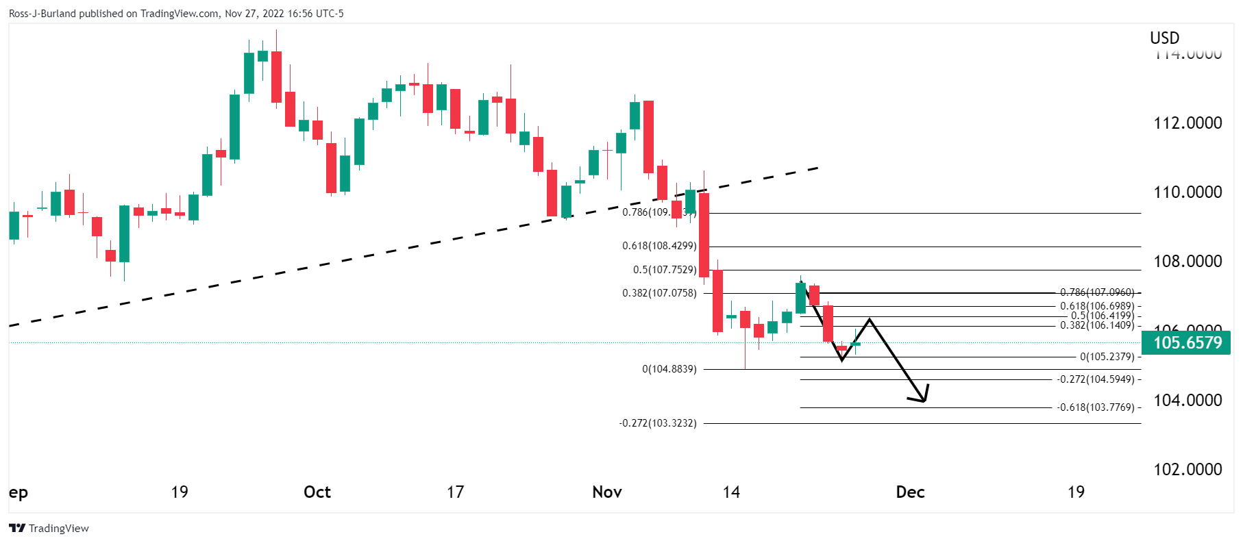 美元处在看涨趋势的背面,美元正展??丅。然而??盘,美元有望展??大幅整理,接近斐波位,如下所示: