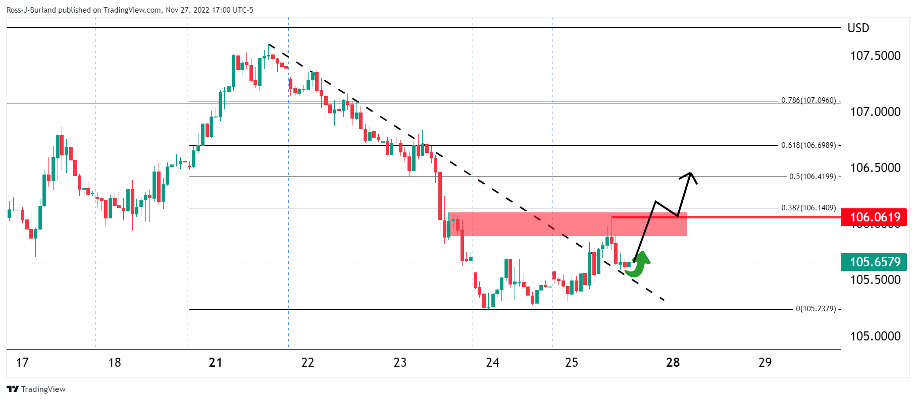 这样一来,小时图显示,若美元突破阻力,有望指向106.50。 In doing so, the price could be expected to move in towards 106.50 on?a break of resistance as per the following hourly chart: