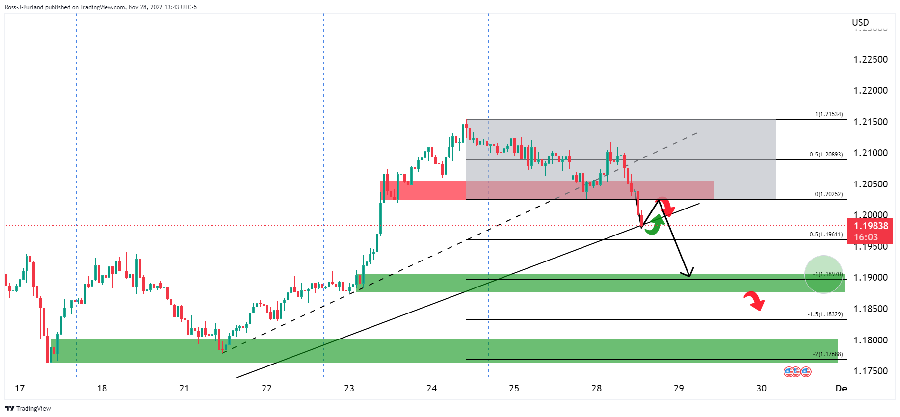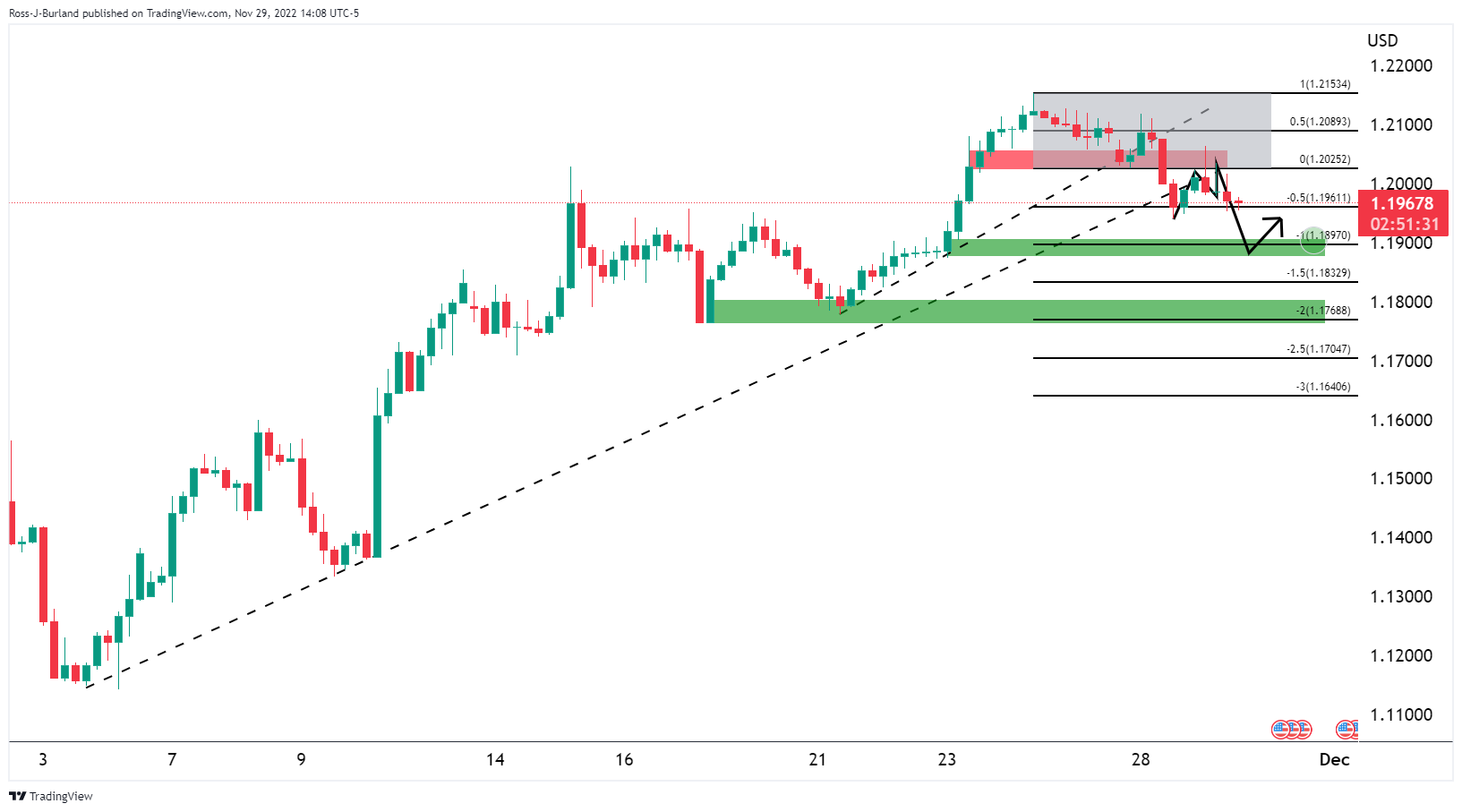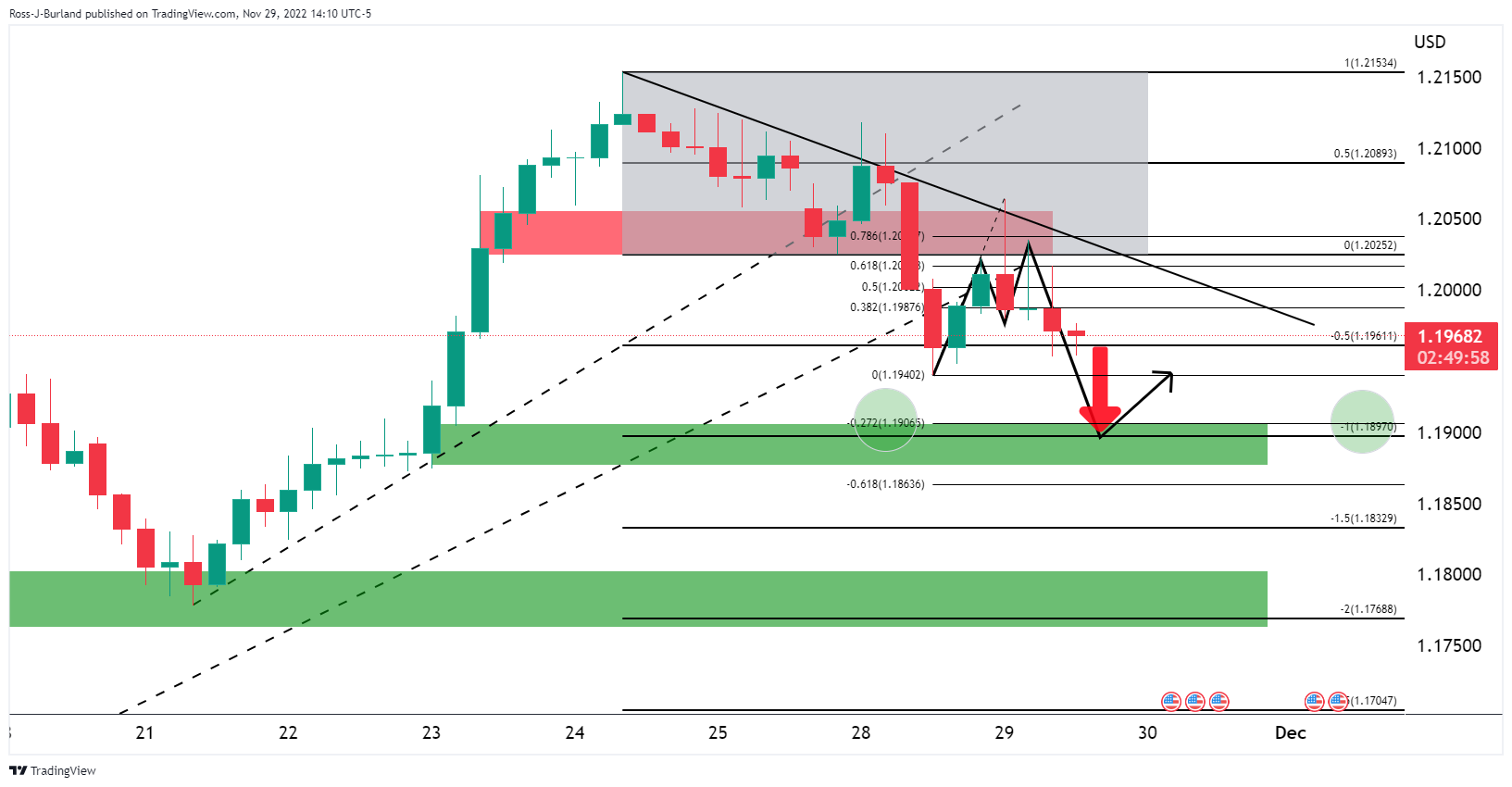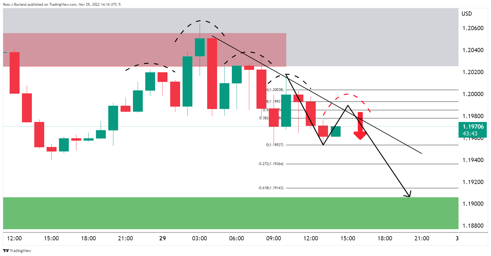 前期分析指出,空头在趋势缐支撑上介入,正在跌破整理区间。该区间100%的按照图划定波动目标在前期形态1.1900,然后是200%按照图形划定的目标1.1800。