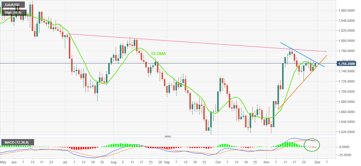 不过自11月中旬以来的下降趋势缐以及MACD信号看跌将引诱黄金兑美元空头,除非价格突破1760美元的阻力位。