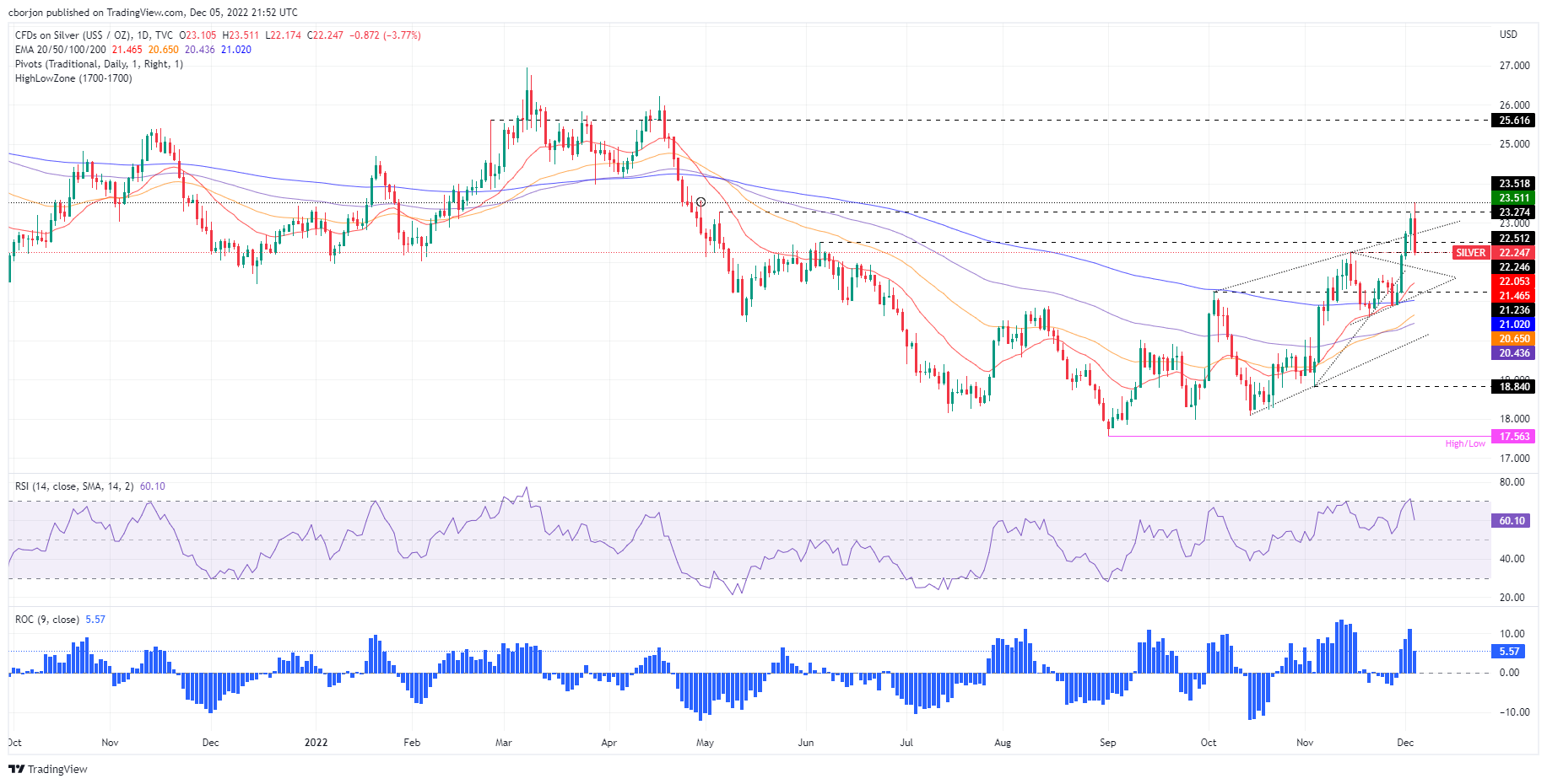 银价价格分析:银价自8个月高位下跌至22.20美元