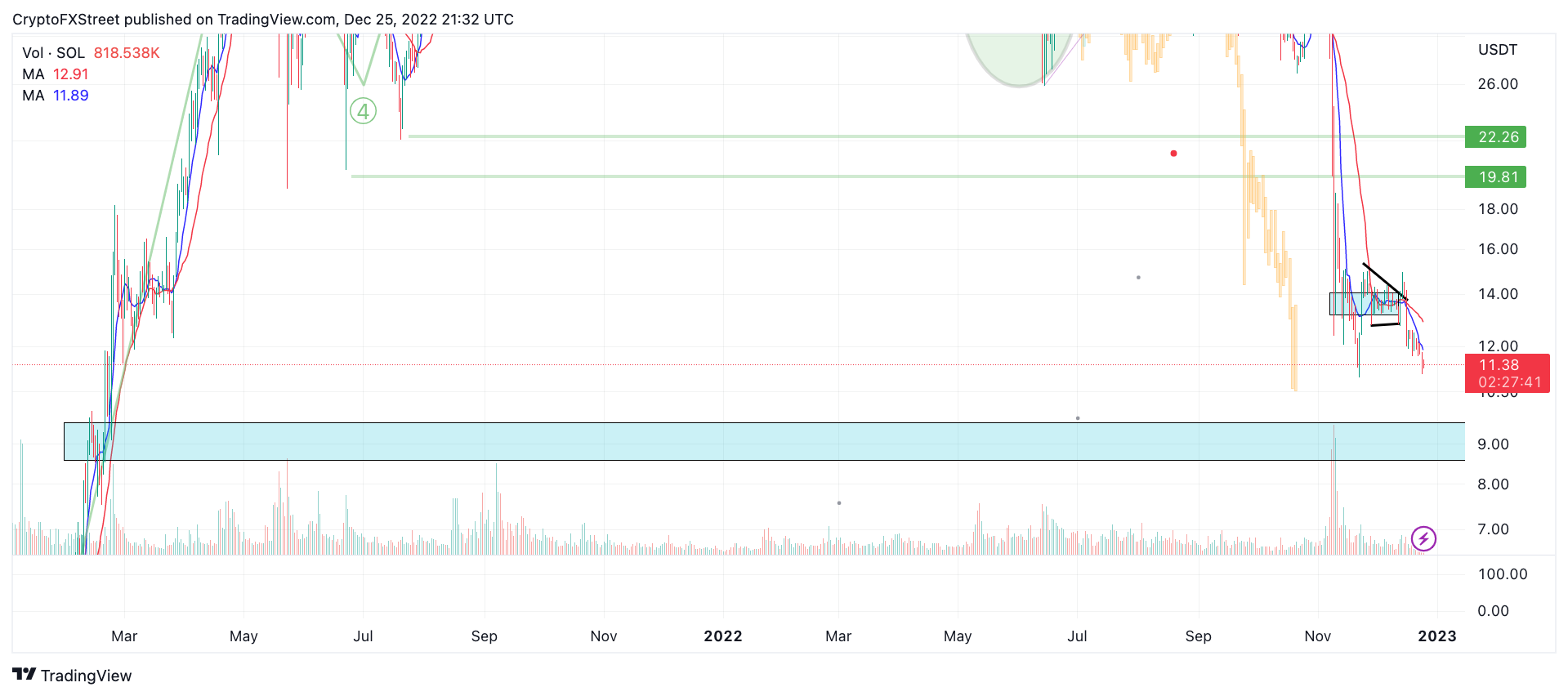 Solanai价格為抹平年度低点做准备。若突破,SOL可能在2023年跌至10美元以下。如果流动性区域接近下跌支撑,确认关键水平以确认SOL的潜在交易区域。