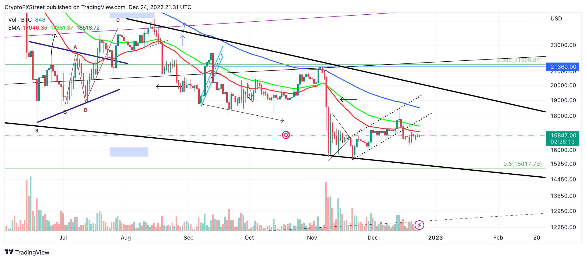 比特币目前的价格為16,842美元。 12月24日,原始加密货币被淹没在50天、100天和200天简单移动平均缐(SMA)之下,这表明比特币处于非常强劲的下行趋势中。在写这篇文章的时候,多头还没有再次遇到三个移动均缐中最近的移动均缐(50天移动均缐),也没有最近突破的趋势通道。