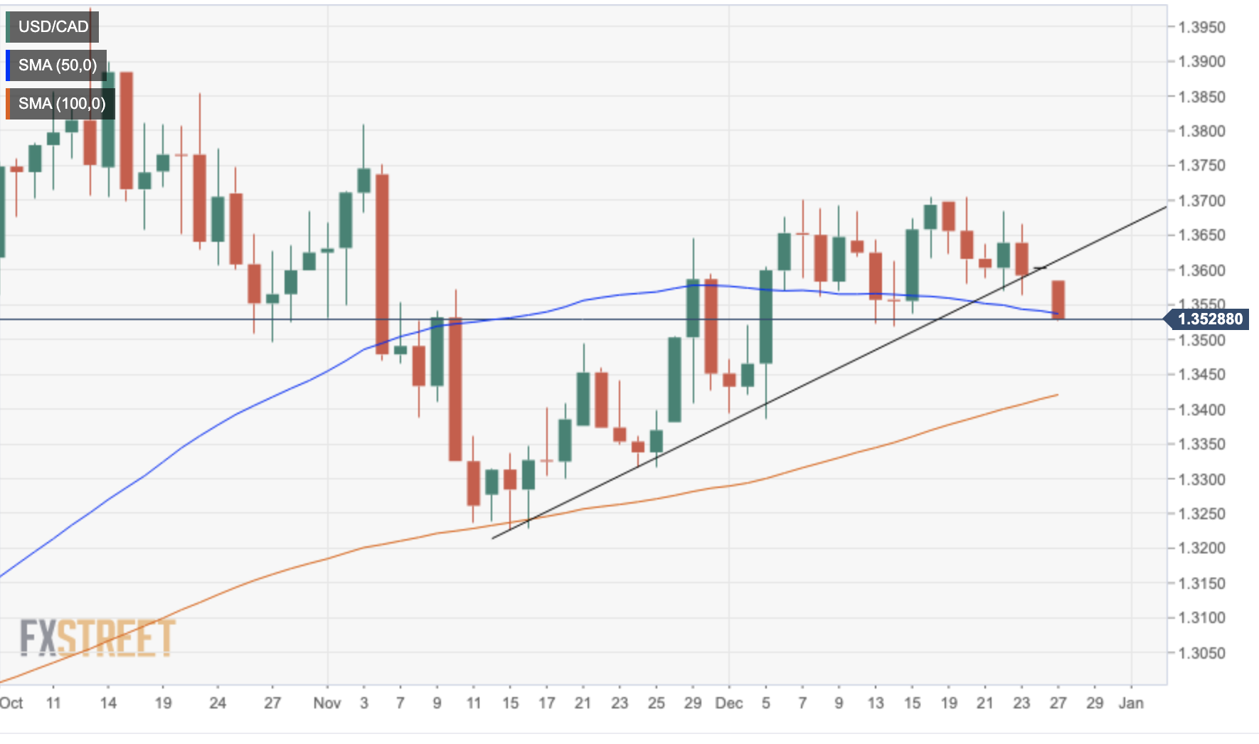 美元/加元周二扩大跌幅,触及1.3526的盘中低点,仅比1.3520的三周低点高出几个点。
