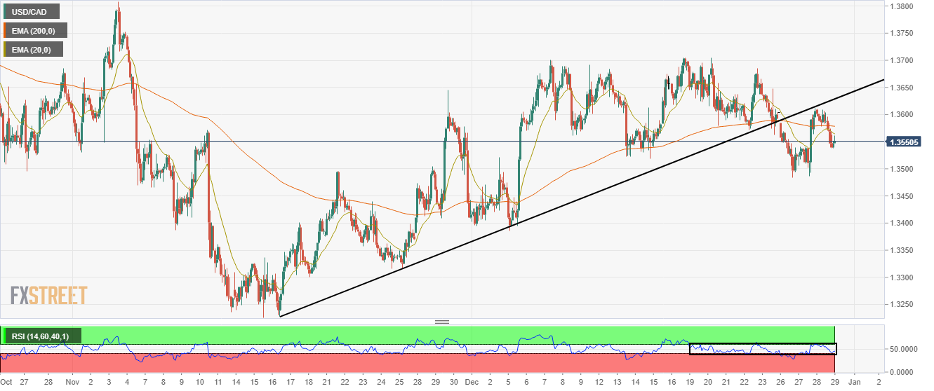 两小时图显示,继未能突破11月16日低位1.3228附近以来的上升倾向趋势后,加元在1.3600附近受到抛压。美元下跌已打压美元/加元跌至20周期指数移动均缐(EMA) 1.3565下方。美元/加元维持在200-均缐1.3579下方,这表明长期趋势现在已经转向看跌。