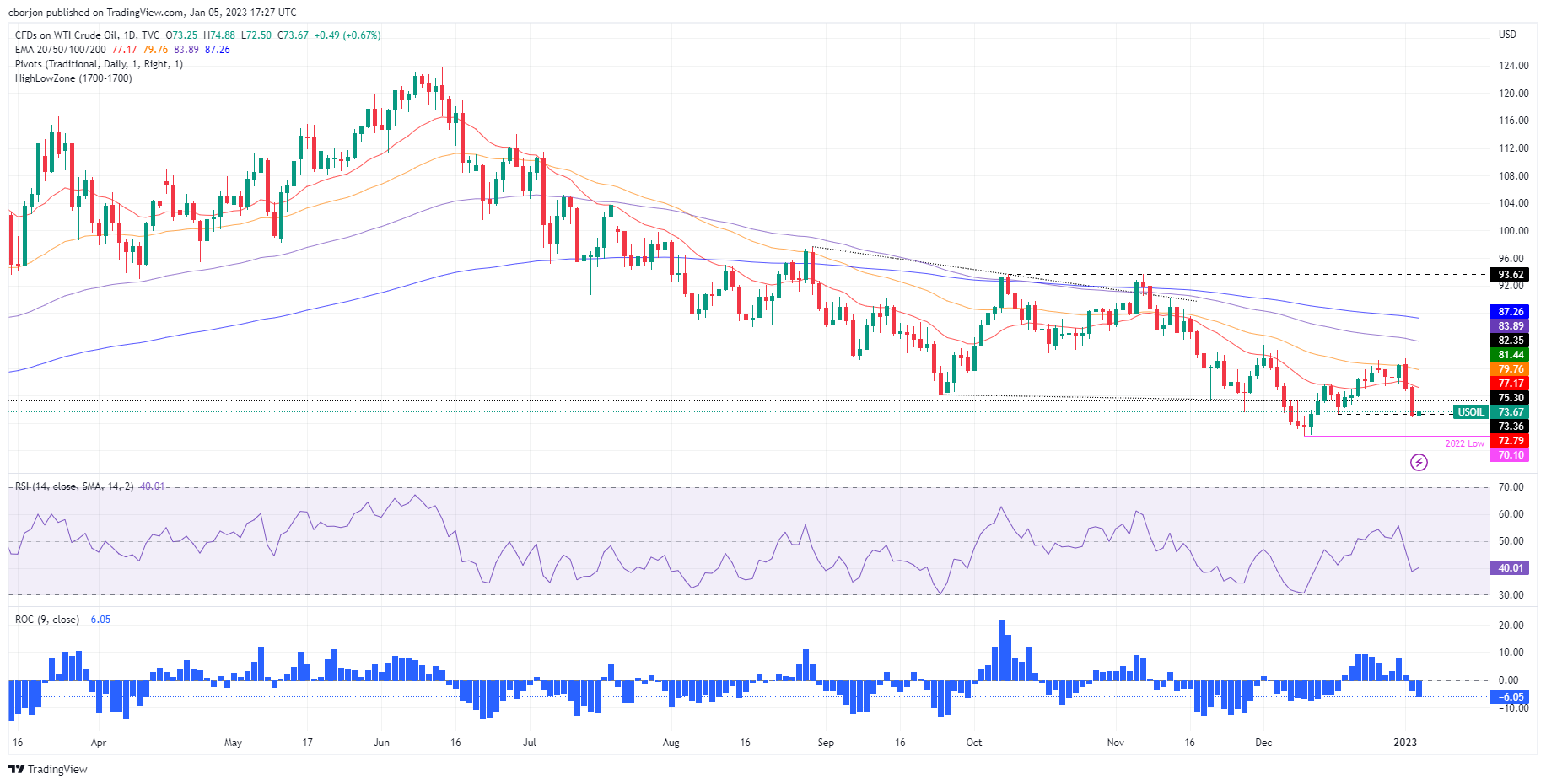 WTI关键支撑位处在73.00美元,然后是72.50美元,然后是2022年低点70.10美元。