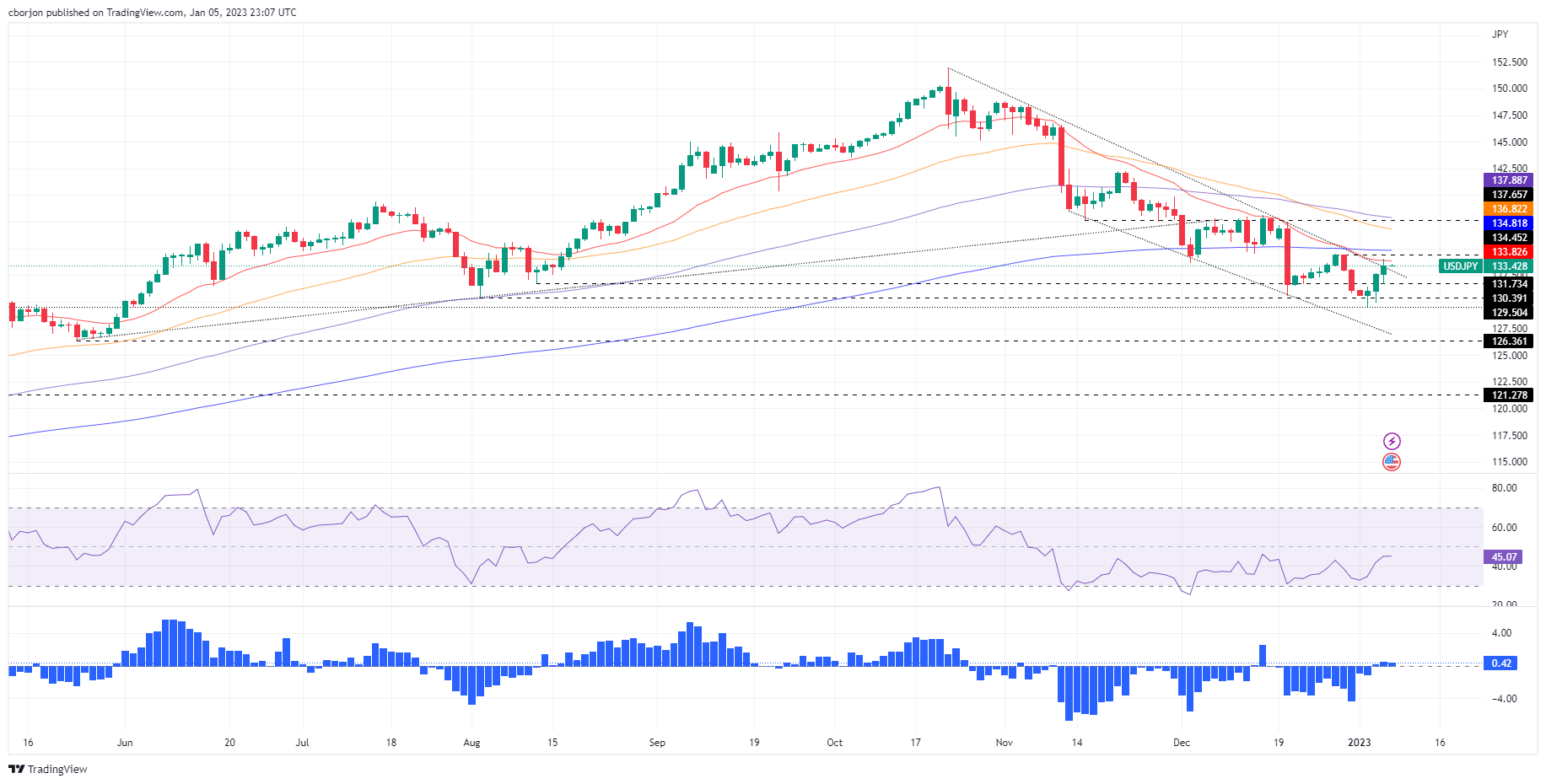 周五亚市??盘后,美元/日元上涨接近20日均缐,继周四上涨0.60%后,仍遇阻133.82区域。发稿时,美元/日元交投于133.42