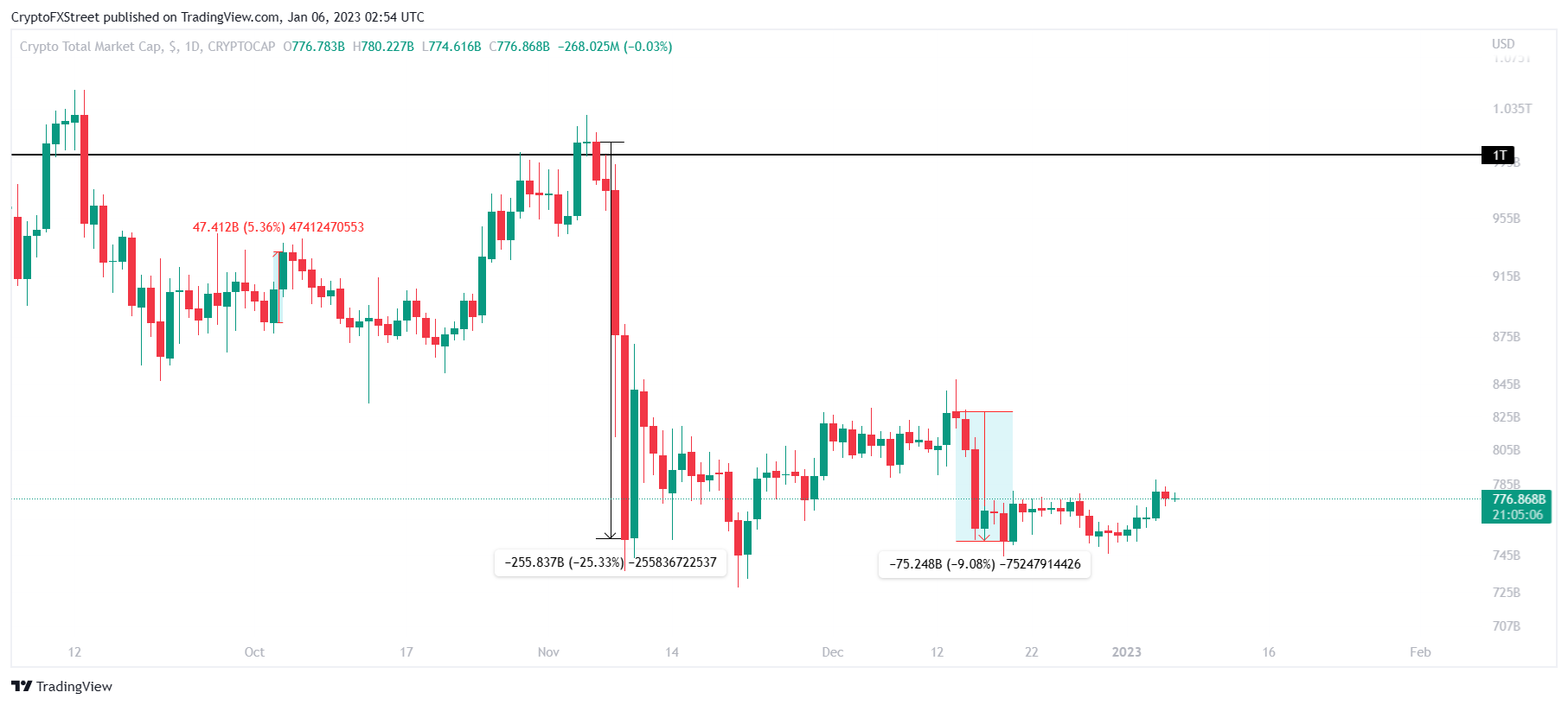 - FTX引发的加密货币寒冬继续影响著市场,加密货币总资本仍处于7760亿美元,处在困境当中。