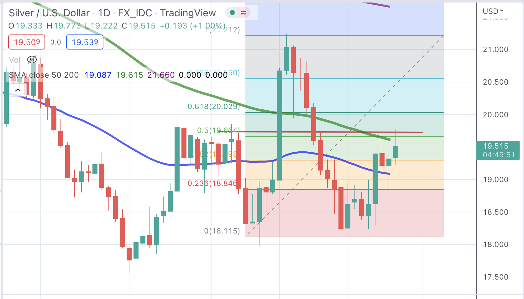 如果银价突破该水平,将测试20.00美元心理水平(上述跌势的61.8% 斐波位) ,然后是10月6日和7日高位20.85美元。