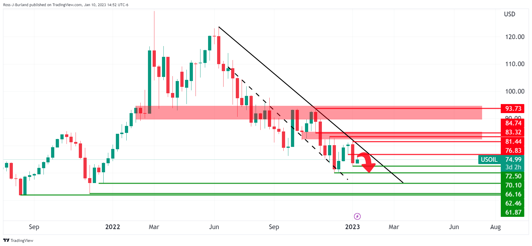 周图趋势显示WTI油价存在看跌倾向,正面临水平阻力。