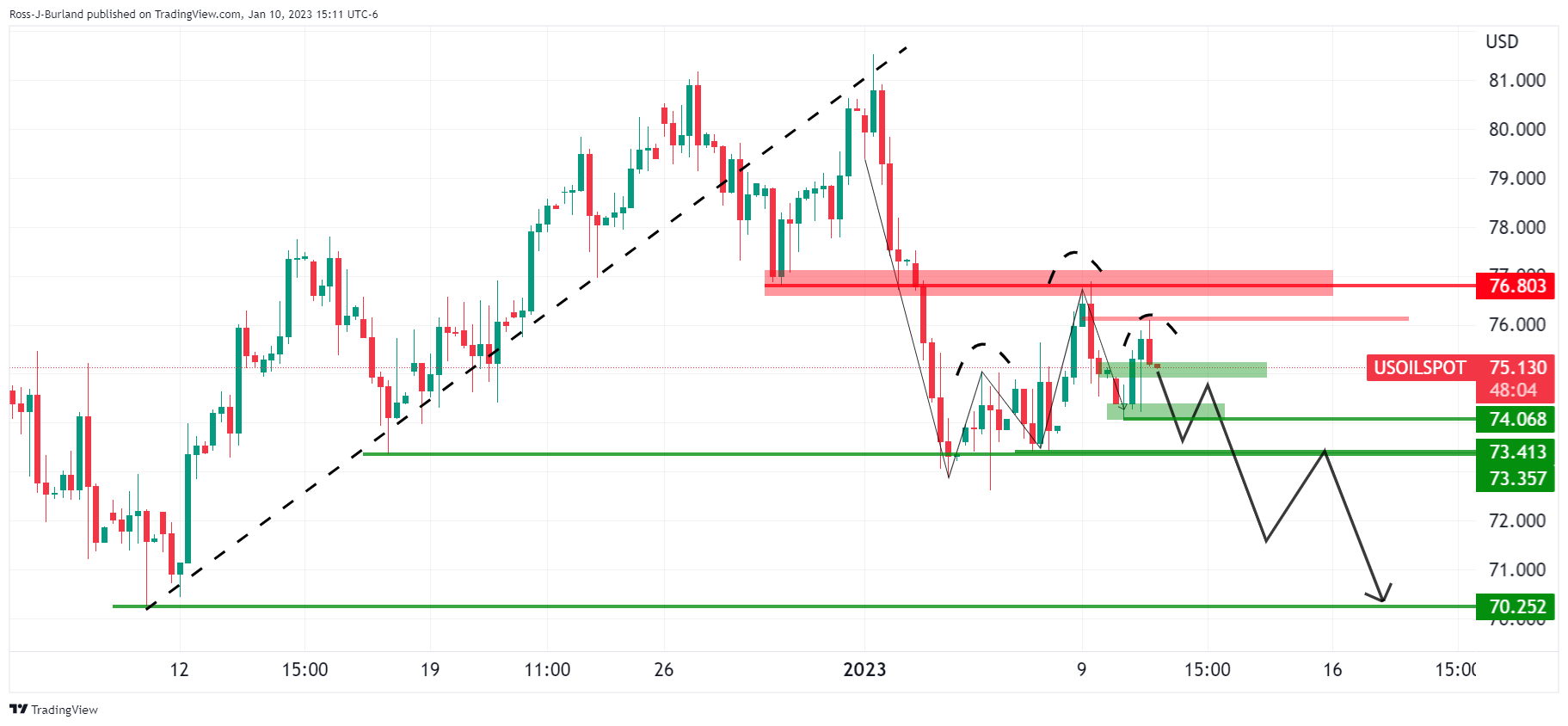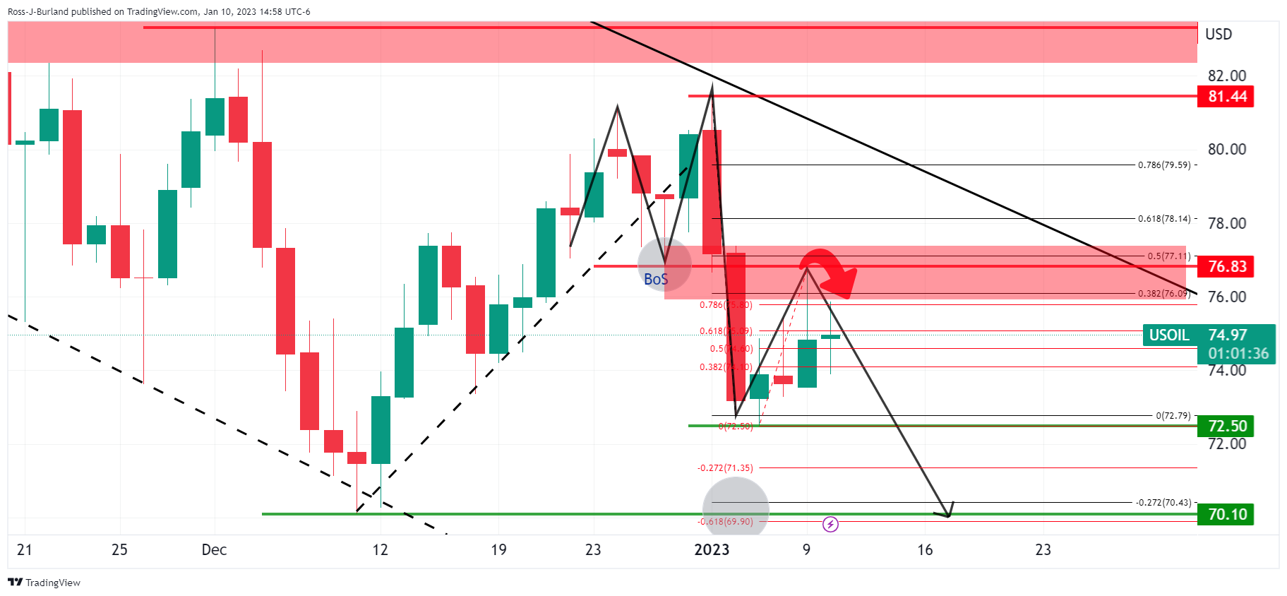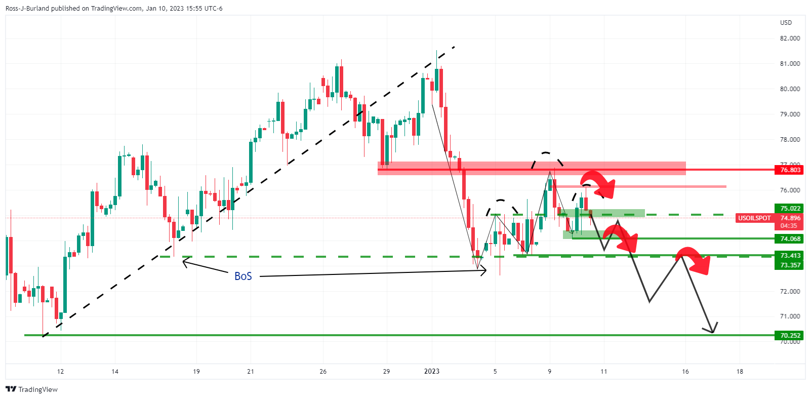 4小时走势图显示WTI油价构筑头肩形态,由于WTI油价跌破肩底,WTI油价倾向于下跌,指向70美元。 The 4-hour chart offers a head and shoulders scenario and given we have already seen a break of structure, BoS, then this gives kudos to the downside bias fore the foreseeable future with $70.00 eyed.?