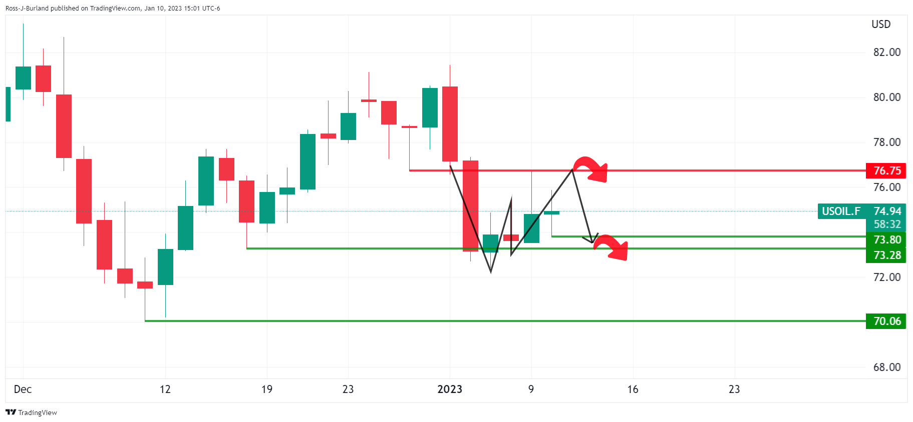 期货图表显示WTI油价正构筑W形态,预期WTI油价将进一步上涨,至少会涨至76.70美元下方。