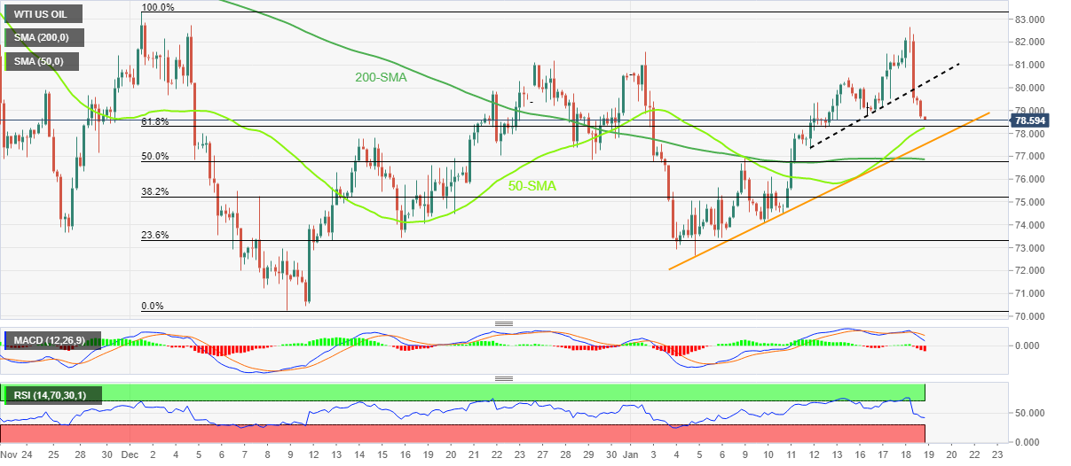 然而,值得注意的是,12月初以来的50-SMA和61.8%斐波位汇合处78.30美元,似乎对短缐空头构成强阻力。
