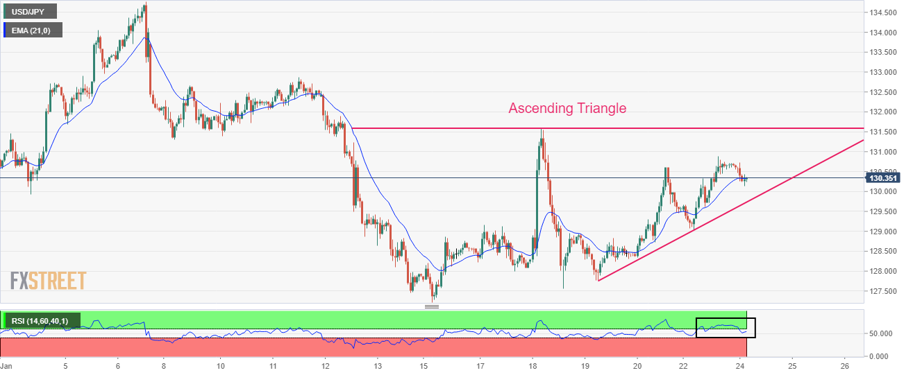 美元/日元出现波动率收缩的迹象,构筑小时图上升三角形形态,这一形态始自1月19日低点127.76以来的上行倾向趋势。而水平阻力处在1月18日高点131.58附近。