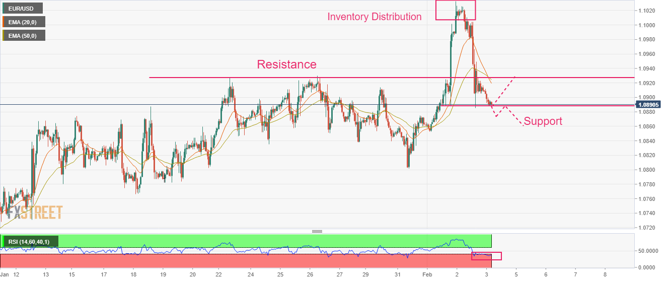 汇价跌至2月2日低点1.0885附近。 20和50EMA均缐在1.0927附近形成看跌交叉,表明汇价后市将进一步下跌。