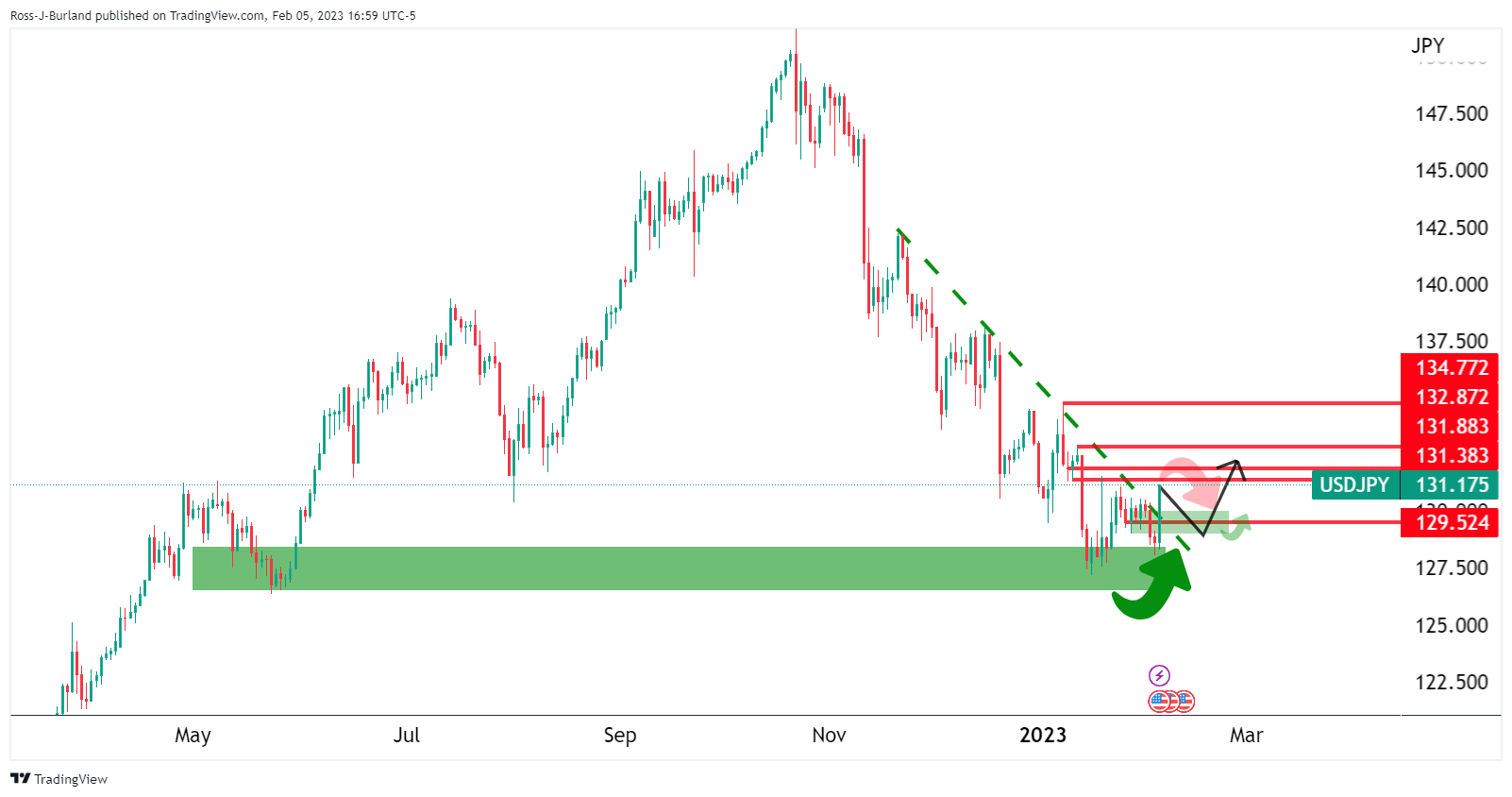 美元/日元已经大幅上涨,继上周五美国非农强劲后,美元/日元指向132.50,目标是132.80,之后是134.70。美国1月份新增非农就业岗位51.7万个,远高于分析师平均预期的18.7万个。这一强劲增长表明,侭管联邦基金利率不断上升,但美国经济仍处在快速增长当中。关键在于非农数据发布的同时,市场正定价美联储政策将转向。